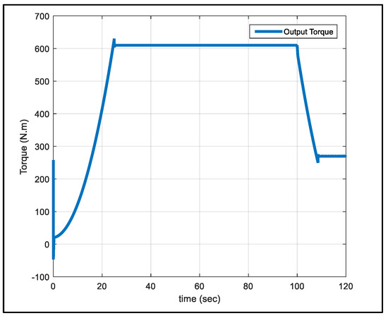 In this section, based on the speed reference curve, the set of network–drive–starter motor–gas turbine is simulated. Figure 17 shows the torque–time plot of turbine output.