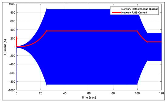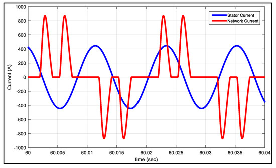 Figure 18 shows the extracted current–time from the network by motor–drive set and Figure 19 shows the details of extracted current from the network by the motor–drive set and stator current.