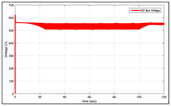 In Figure 20, the very high value of THD during initial moments is due to measurement error caused by the generated transients at drive starting moment. After the initial transients, it is observed that THD value is reduced after some time and accompanied by the increase in motor speed and torque. When the speed, output torque and, consequently, output power of motor in addition to the input power of drive become constant, THD value also remains the same. At t = 100 s and with the decrease in speed along with changes in torque and power, THD value rises. DC bus voltage is displayed in Figure 21.