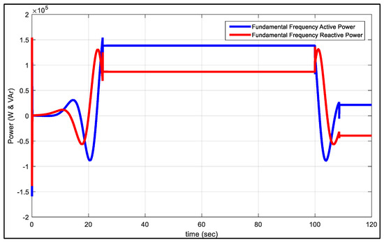 Figure 24 shows the active and reactive power of the main three-phase frequency extracted from the network. The amount of active and reactive power of the main frequency extracted from the network is found using Equation (17) in which and are, respectively, the effective current and effective voltage of the main component of network line and is the phase difference between the two.