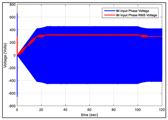 As evident from Figure 25, the motor input frequency increases according to the speed reference curve. When the speed is constant around 2400 rpm, the motor input frequency is held constant by the drive at 80 Hz. Figure 26 displays the induction motor input voltage.