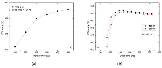 As shown in Figure 9a, the efficiency (η) is higher than 97% in the range of considered input powers, higher than 98% for power above 300 W. In Figure 9b it can be seen how η presents its maximum value for a dead-time equal to 166 ns, using a switching frequency of 100 kHz, with a maximum value of 98.7% at 400 W of input power.