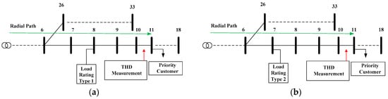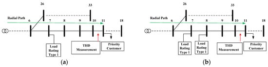 (a) Non-linear load connected at bus 7; (b) Non-linear load connected at bus 7 and bus 8. THD: Total Harmonic Distortion.