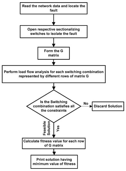 A flowchart for finding SR plan through conventional deterministic method is shown in Figure 4. This process is very accurate, but due to the large size of matrix M, the computation time is more. Consequently, to reduce this computational burden and to make SR plan executable in real time scenario, meta-heuristic optimization techniques are used to solve service restoration problem.