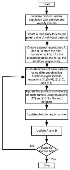 The MOPSO programming complexity is less, which makes this algorithm faster than the other optimization techniques. As the time consumption is less, this algorithm is suitable for service restoration problem. The MOPSO algorithm starts with random solutions as the initial swarm. The position and velocity are updated just like regular PSO method. But in this method, the concept of pbest and gbest for each particle is different. Each particle has only their best experience value, which is pbest, stored as memory in a repository. After each iteration, this position is compared with the updated position. If the updated position is better than the existing pbest value, then this updated position is the new pbest value; otherwise, pbest for the particle remains the same. Simultaneously, a global best solution is also stored in an external repository, where all the best non-dominated solutions are stored. If the crowding distance between two non-dominated solutions present in the external repository is less, then the probability of selection of that solution as the final optimal solution is also less. A Roulette Wheel Selection (RWS) method can be used to select the Pareto fronts. Good “trade-off” solutions can be obtained from MOPSO that represent the best possible compromises among the objectives []. The objective is to find a Pareto optimal set which consists of feasible solutions.