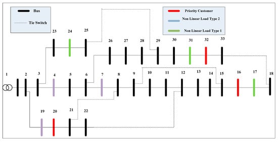 where ßp represents a set of buses through which priority customers are connected to the system. NLi (R) represents the number of non-linear loads connected in the radial path of priority customer i for restored network topology. PCt (R) is the total number of priority customers present in the restored network. mN (R) represents the average value of the number of non-linear loads connected in the restored network (R) for each priority customer. In the radial distribution system, there will be only one path from a source node to a particular bus. Therefore, the NLi (R) can be easily calculated for a particular topology.