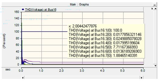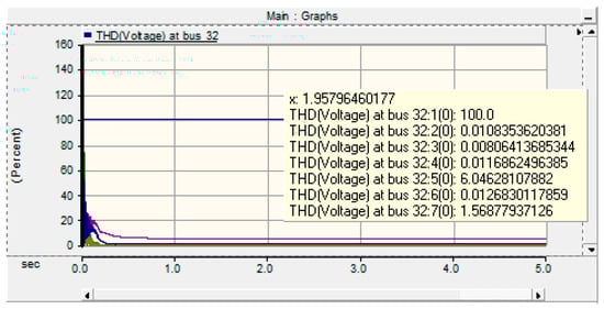 When the rating of the non-linear load is changed (shown in Figure 3b) from the reference case, the THD value obtained at bus number 11 is 4.37%. So, it can be concluded that the harmonics injected by the different types of load or different rating of the load will be different.