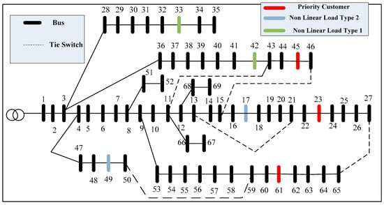 Figure 10. IEEE 69 bus test system. - Priority customers are present at bus 23,45,61