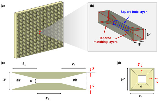 Sketch of a dielectric transmitarray and blow out of the unit-cell structure. (a) dielectric TA; (b) UC perspective view; (c) UC side view; (d) UC top view.