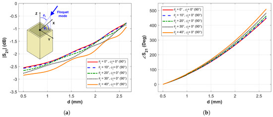 As also pointed out in [16], the scanning capabilities of a transmitarray depend, in the first instance, on the feature of the unit-cell, whose behavior must be as less as possible subject to the direction of arrival of the unit-cell, i.e., both the phase and the amplitude of have to stay almost the same when the angle of incidence varies. In fact, this feature guarantees that, changing the angle of incidence, no higher modes resonate, as occurs for other unit-cell (see for instance [13]), degrading the antenna radiation performances and also that, when the direction of arrival changes, due to a variation of the position of the feed, the behavior of the unit-cell is not completely different from the presumed one. To study what happens in the unit-cell considered here, it has been analyzed using the Floquet excitations in CST MW Studio, used to compute the transmission coefficient as a function of d, for several angles of incidence (see inset in Figure 3a for its definition). The curves representing the variation of the amplitude and the phase of are shown in Figure 3a,b, respectively. They have been calculated at and for 10, 20, 30, 40. Since the analyses for TE (0) and TM (90) modes provided the same results, only a single curve is plotted for each incidence angle. As it can be observed in Figure 3a, the amplitude of is slightly affected by direction of arrival of the incident wave, with a reduction not greater than 0.5 dB when 40. For what concerns the phase, from Figure 3b, it emerges that both its linearity and full range of variation are not affected by : in fact, the different curves are almost a translated copy of the other, with small changes in the slope. This means that the dielectric unit-cell behavior is not particularly sensitive to the angle of incidence, and this makes it a potential good candidate for the realization of a beam scanning TA, more suitable than other unit-cells, as some of those using metallic printed elements, where the oblique incident wave excites superior modes, at their turns responsible for a strong reduction in the amplitude of the transmission coefficient and discontinuities in the phase variation.