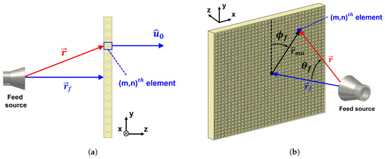 where is the propagation constant in free-space, represents the distance from the feed to the -th element, whose position is located by , and is the unit vector describing the main beam direction. The vector determines the feed position, which is considered to be aligned to the center of the TA surface. The quantity is a constant phase value, indicating that a relative phase rather than the absolute transmission phase is required for the transmitarray design. Using the array theory, the far-field radiation pattern for a rectangular aperture transmitarray of elements can be predicted using the following approximated expression: