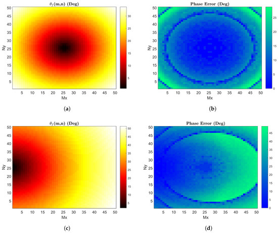 where is the transmission phase computed with a normal incidence ( 0), while takes into account the different behavior of the UC with varying and it has been evaluated from the curves obtained in Figure 3b. In Figure 5b, the resulting phase error distribution for the 50 × 50 TA is plotted: as it can be observed, at the center, the phase error is lower than 5 and it can be considered negligible, while beyond the phase jump, the error increases arriving up to about 30. It is higher when the position of the feed changes, as occurs during the mechanical beam scanning considered here. For instance, if we consider a scanning angle of −30, the distribution of the incident angles becomes that in Figure 5c, in which the maximum angle achieved on the right corners is 51. In Figure 5d, it can be observed that the phase error related to this case has increased, reaching a maximum of about 45. Moreover, another important aspect has to be taken into account when the feed is rotating. If the Transmitarray is designed as a center-fed configuration, it is necessary to consider an additional phase error due to the difference between the required phase distribution needed when considering a different feed angle position and the required phase distribution for the center-fed case. Thus, the total phase error for scanning angles is the following: