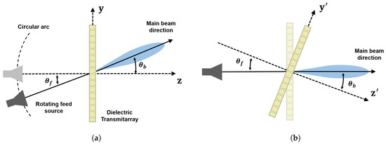 The feed is a circular horn working in Ka-band: it has a gain of 17 dB at 30 GHz and its pattern can be modelled as with 12.5. The focal distance between the horn and the dielectric structure is 150 mm ( 1). Since here the main interest is in investigating the scanning capabilities of the TA, the beam steering that is obtained with a relative rotation between the two parts of the antenna, i.e., the transmitting surface and the feed, and this is equivalent to moving the horn along a circular arc having the center coincident with that of the TA itself, has been sketched in Figure 6a. In this way, the offset angle of the field impinging the TA changes, and consequently the direction of the main beam, is denoted with . A range of variation for of 60 in the E-plane has been considered for the transmitarray proposed here.