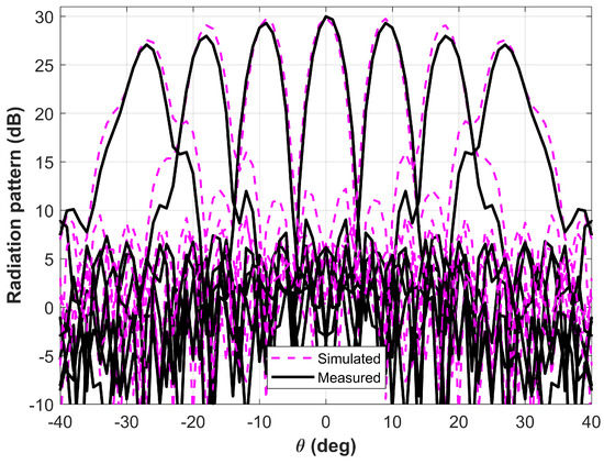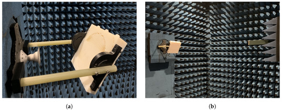 Note that, to simplify the antenna assembly, the beam steering mechanism illustrated in Figure 6a is implemented in a slightly different way, as appears from Figure 7a more clearly from the sketch in Figure 6b: it is the TA that rotates around an axis in the horizontal plane, namely the x-axis in the reference coordinate system adopted in Figure 6, passing through the junctions that connect it to the supports; if this rotation is such that the angle between the y- and the -axis in the sketches of Figure 6b is equal to , the field radiated by the field impinges on the TA surface with an angle that is actually ; in other words, it is sufficient to make a rotation of the coordinate system to overlap the drawing in Figure 6a to that in Figure 6b and this proves that they are equivalent. In the anechoic chamber, the measurement of the radiation pattern is done performing a 3D scanning in , where and are the angles used in the spherical coordinate system; when the measurement in the E-plane (i.e., the -plane in Figure 6) is performed, the radiation pattern as a function of is obtained. Therefore, is immediately found in the correspondence of the direction of maximum radiation and operating a translation proportional to the rotation applied to the Transmitarray, i.e., the angle .