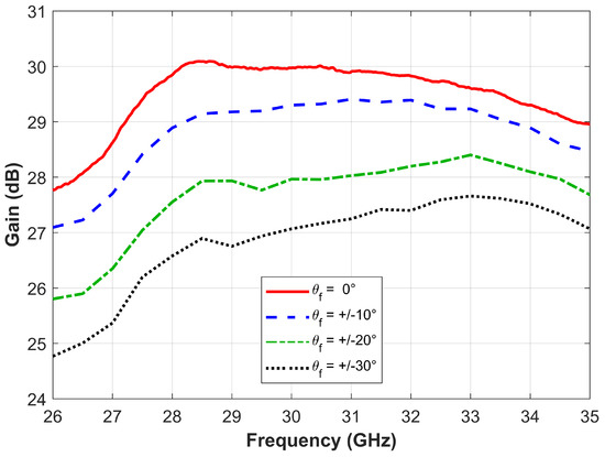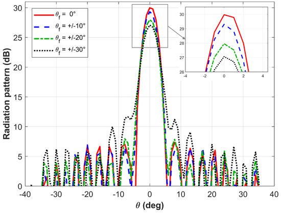Figure 9 shows the measured radiation patterns in H-plane, with a blow-up of the region close to the maximum in the inset. Apart from the reduction of the maximum gain, the radiation patterns are almost unchanged for , and also for the most significant effect is just a contained increase of the side lobes. In both Figure 8 and Figure 9, only the co-polar component of the radiated field is shown, to not make the plot incomprehensible, but the values of the cross-pol measured at 30 GHz for each considered pointing angle are reported in Table 1: in all cases, it stays very low, reaching a maximum value of about −36 dB.