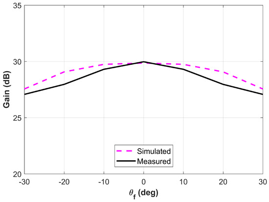 In Figure 10, the frequency variation of the gain for the different scanning angles is plotted, while the values of the 1-dB bandwidth are reported in the last row of Table 1. For the different values of , the 1-dB bandwidth remains larger than 23% and this represents an advantageous feature with respect to other transmitarray configurations implemented with metallic-dielectric elements, which have in most cases a narrow band and it decreases furthermore when the direction of maximum radiation changes. In Figure 11, the behavior of the measured and simulated gain at the design frequency as a function of the scanning angle is finally shown: the flatness of the curves is a further proof of the excellent scanning capabilities of the designed antenna; moreover, it is worth noticing the good agreement between the simulated and measured results.