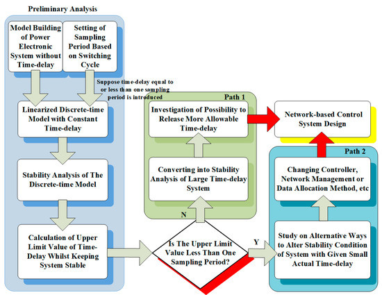 We may have problems or challengers when we take advantage of the convenience of the communications in power electronic field. For example, the potentially negative aspects, such as time-delay and data dropouts, would somehow hazard the network-based control system or degrade the performance. The flow diagram shown in Figure 1 includes an analysis methodology that explains how to deal with the negative effect of time-delay.