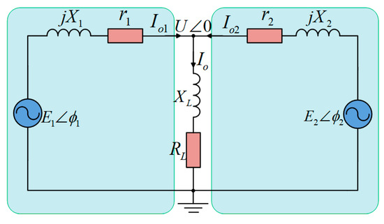 The AC/DC inverters operating in parallel mode are equivalent to voltage source inverters (VSIs). The controller includes voltage/current control loops and droop control method. If the link impedance and output impedance are considered inductive and the equivalent circuit for two inverters in parallel are shown in Figure 3, the active and reactive power injected to the bus by every unit are expressed as follows [31]: