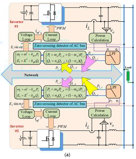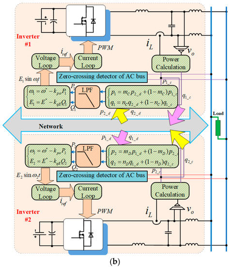 Another method, the Transient Power Method (TPM), with the example of the two-inverter parallel system, is shown in Figure 4b, where each inverter has two kinds of transient powers (active and reactive power) transferred to communication bus. The transient power is obtained from the calculation based on sampling output current and voltage of the inverters. Once each inverter obtains the power data of others from network, a weighted process towards output instantaneous active and reactive power is activated and served for obtaining control power by Low-Pass Filters (LPF). This weighted function is defined as