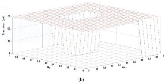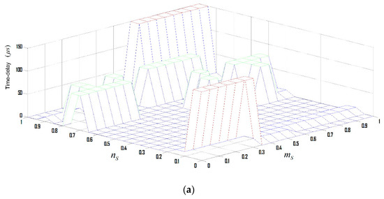 Analysis methodology discussed in Section 2 tells us that no matter how much the actual time-delay is, the rough estimation of stability within one sampling time could be carried out. Returned to the strategies proposed in Section 3, stability analysis becomes multidimensional due to the existence of control coefficient mS, nS, mT, nT, and time-delay τk. The boundary curves used for addressing the upper limit time-delay maintaining system still stable are obtained by Schur criterion, as shown in Figure 5. The result reveals that the stability features of SPM and TPM towards time-delay are remarkably different. In SPM result as depicted in Figure 5a, where three-dimension coordinates are adjustable coefficients ms, n,s and maximum allowable time-delay, there are few cross-columns with different depths to show that only these regions with particular ms/ns combinations have relatively large allowable time-delay, the rest area is covered by zero-close flat surface. It means network-based system stability is dominantly affected by time-delay in SPM. Nevertheless, in the TPM results shown in Figure 5b, except only a small part of region showing the allowable time-delay is tiny, other upper value in the regional surface can be rushed into 150 μs, which could be even bigger if we release the 150 μs restriction. The conclusion can be drawn that system is less influential on the time-delay impact in TPM. From the angle of control, the system shows its susceptibility to the time-delay and the control parameters should be elaborately designed for mS and nS to keep system stable in SPM. On the other hand, control coefficient mT and nT still cannot be designed arbitrarily even system is basically regarded as delay-insensitive in TPM. In addition, the stability criteria described in this section is used to reach a guidance conclusion on the qualitative analysis of time-delay impact. The quantitative accuracy is dependent on the precise model of power electronic systems and the theoretical analysis methods we are seeking.