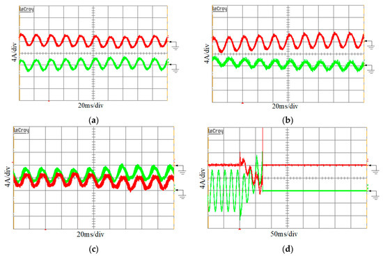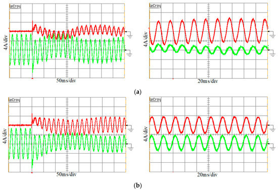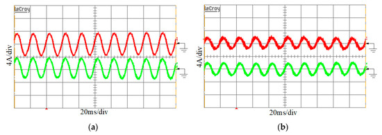 For SPM as discussed in Section 3, its weak resistivity over time-delay accelerates its speed to pursuit reliable and high-speed network. Based on the analysis methodology proposed in Section 2, “Path 2” offers one practical way to reverse original system instability and enhance the performance if we keep the network condition unchanged. In this experimental test, control coefficients were predefined as mS = 0.3, nS = 0.6, the output current of parallel inverter system is shown in Figure 9a, dynamical property is not desirable, and it takes long time to reach relatively steady state. In addition, the system seems to be unstable even after several oscillation periods. From Figure 9a, it can be seen that output current is highly distorted and current-sharing error is considerably large in steady-state. In this scenario, based on Criterion 2, the control feedback gain matrix K, which is contained by mA, mB, nA and nB, is modified, and a new K illustrated by (A28) is achieved. Corresponding change can be reflected by experimental results, which was demonstrated by Figure 9b. In both the dynamic and steady state, the parallel system witnessed significant improvements. It needs to be noted that “Path 2” contains a number of methods besides altering controller based on time-delay property. For example, the change of data-processing method of transmission to enhance performance, which had been tried in Reference [16]. Deviations exist between theoretical and experimental verification toward modified control feedback, and how to reduce and eliminate them is mostly dependent upon accuracy of mathematical model building on power electronic system.