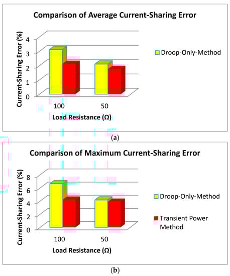 Comparison of average and maximum current-sharing errors by using droop-only-method and TPM. (a) Average current-sharing error. (b) Maximum current-sharing error.