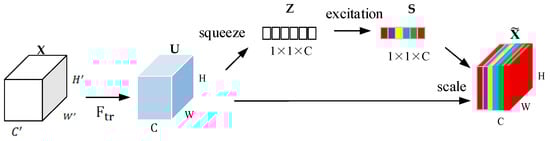 Before the SE block operation, input data X is transformed into features U through a series of convolution operations, i.e., , X ∈ RW′×H′×C′, U ∈ RW×H×C, where represents the transformation from X to U, H (H′) and W (W′) are the frame height and width, respectively, and C (C′) are the number channels.