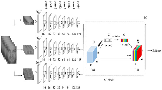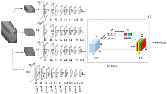 The structure of the proposed SETFNet is shown in Figure 2. It is a three-stream 3D CNN consisting of three identical sub-networks. Each sub-network consists of four convolutional layers and has the same parameters. The number of convolution kernels for the four convolution layers, first through fourth, is 16, 32, 64, and 128, respectively. The kernel size of the first convolution layer is 3×3×8, and a large temporal stride here is used to eliminate some useless information. The kernel size of the other three convolution layers is 3×3×3. The three streams were fused and followed by an SE block to recalibrate the weight of each stream. The details of each subnetwork are shown in Table 1.
