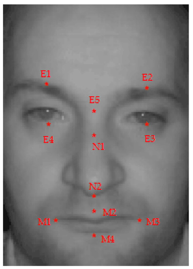 The cropping of these local areas was done by an automatic method. Since some of the cuts are inaccurate, manual cropping was used. Using the facial landmark points annotated earlier, the three regions were identified by using rectangular bounding boxes determined based on the eyes, nose, and mouth landmark points. We segmented the three local regions according to the following eleven points: E1 (), E2 (), E3 (), E4 (), E5 (), N1 (), N2 (), M1 (), M2 (), M3 (), and M4 () (shown in Figure 3). The center point of the rectangular bounding box of the eye region is L1 = E5 (), and the length and width of the rectangle are and ||, respectively. The center point of the rectangular bounding box of the nose region is L2 = (), and the length and width of the rectangle are || and ||, respectively. The center point of the rectangular bounding box of the mouth region is L3 = (), and the length and width of the rectangle are || and ||, respectively.