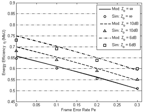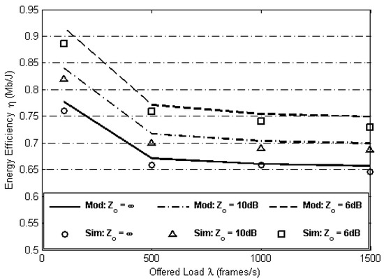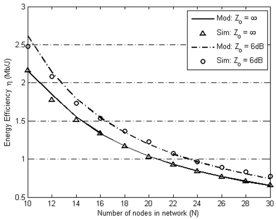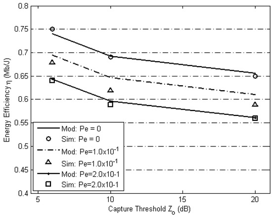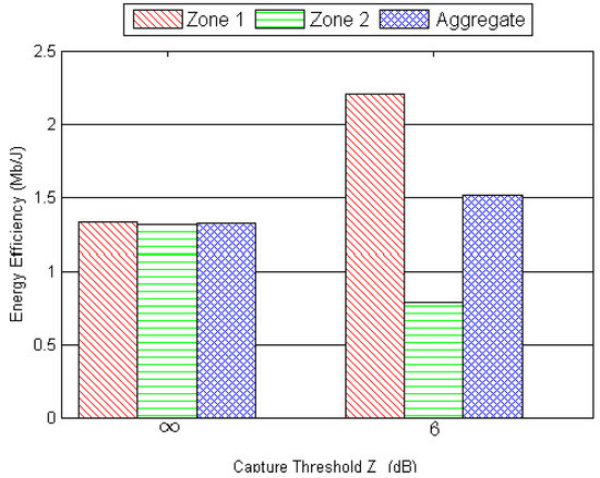 Simulations were performed with and without the capture effect as shown in Figure 8. At first, Figure 8 shows that in the absence of capture effect, i.e., = ∞, energy efficiency of both zones is almost equal, i.e., = 1 but this fairness comes at the cost of lower aggregate energy efficiency, i.e., = 1.30. In the presence of the capture effect, when = 6 dB, although the aggregate energy efficiency was improved, i.e., = 1.51, but this caused unfairness, i.e., energy efficiency of the group of nodes in zone 2 was only = 0.7 Mb/J as compared to energy efficiency of the group of nodes in zone 1 which was = 2.2 Mb/J.