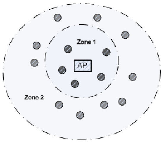 The simulation scenario consists of WLAN as shown in Figure 7 having AP in the centre of the network. Let the total number of nodes in network be = 20 and number of nodes in Zone 1 and Zone 2 are = 10 and = 10, respectively. Groups of nodes in Zone 1 and Zone 2 surround AP at distances of 40∼50 m and 70∼140 m from AP, respectively. Traffic in both zones is saturated, transmission failure due to erroneous channel is negligible and = 2000 bytes.