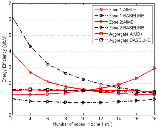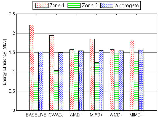 In the remaining paper we choose AIMD+ and compared its performance with the baseline in various settings. We compared the energy efficiency obtained by nodes in Zone 1, Zone 2, and aggregate network energy efficiency for the baseline and AIMD+, shown in Figure 11. In this experiment, the total number of nodes in the network remained constant, i.e., = 20 and the number of nodes in Zone 1 and Zone 2, denoted as and , respectively, varied from 2∼18. At first, this comparison shows that the aggregate network efficiency, for both baseline and AIMD+, overlap each other and that our proposed solution does not compromise on the aggregate energy efficiency. Secondly, energy efficiency of nodes in Zone 2 when using AIMD+ always remains higher than the baseline method for any value of . Thirdly, when using the AIMD+ mechanism energy efficiencies for both Zone 1 nodes and Zone 2 nodes approach convergence when = = 10, indicating AIMD+ is substantially fairer than the baseline.