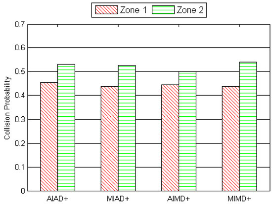 To validate our argument of AIMD+ being superior to the rest of the three presented algorithms we determined the collision probability of nodes in each of the two zones and compare them in Figure 10. It can be seen from Figure 10 that AIMD+ significantly reduced the collision probability of Zone 2 nodes followed by AIAD+, MIAD+ and MIMD+. The feature of additive increase in transmission power in both AIMD+ and AIAD+ effectively reduced the collision probability in Zone 2 nodes and thereby increased fair energy consumption and efficiency whereas as the multiplicative increase in MIAD+ and MIMD+ increased the collision probability of Zone 2 nodes. From Figure 9 and Figure 10, it can be concluded that AIMD+ performs better than the baseline and the remaining three transmission and CW control algorithms, i.e., MIAD+, AIMD+, and MIMD+. We also performed simulations when there were for more than two zones in the network and found similar results as above. Due to space limitation we do not illustrate those results here. Instead we performed some extended simulations and illustrate the obtained results in the next subsection.