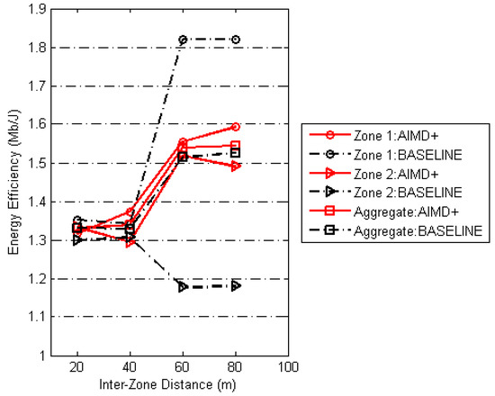 Figure 12 compares energy efficiencies obtained using AIMD+ and baseline with varying inter-zone distances. Similar to Figure 11, = 20 whereas and are fixed to 10. At first, we see the overlap between the aggregate energy efficiency obtained using AIMD+ and baseline. It means our proposed solution is effective in maintaining the overall aggregate energy efficiency. Secondly, we see that when the inter-zone distance was initially 20 m, there was no difference between the energy efficiencies obtained via baseline and AIMD+ for both zones. The reason is that at 20 m difference there are very few successful captures. Most simultaneous transmissions turn into collisions, hence, AIMD+ is rarely invoked. Moreover, as the inter-zone distance starts increasing capture starts happening frequently that causes unfairness between the energy efficiency of Zone 1 and Zone 2 using the baseline. At 40 m inter-zone distance this unfairness reaches its peak. In contrast to baseline our proposed solution improves efficiency of Zone 2 nodes in addition to keeping unfairness to minimum unlike baseline. Even though energy efficiency of the group of nodes in Zone 1 decreases using AIMD+, overall energy efficiency remains same and fairness improves to the maximum level for all values of inter-zone distance.
