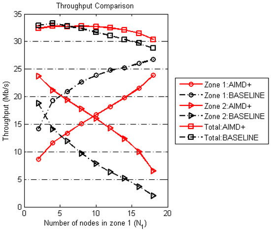 We also compare the throughput performance obtained by baseline and AIMD+ in Figure 13. Similar to Figure 11 the total number of nodes in network is = 20 and and vary from 2∼18. At first, it can be seen in Figure 13 that the total network throughput when using AIMD+ either remains equal or higher than the case when using baseline. Secondly, throughput for the nodes in Zone 2 always remained higher for all the values of . Thirdly, we can see that throughputs of Zone 1 and Zone 2 nodes coincide when approaching the case = = 10, again indicating that AIMD+ is more fair than the baseline in which the convergence of throughputs of Zone 1 and Zone 2 nodes happen when = 3 and = 17. Finally, it can be seen that throughput for the nodes in Zone 1 when using AIMD+ is always lower than when using baseline. It shows that AIMD+ effectively controls Zone 1 node’s access to the channel in order to maintain channel access fairness among the nodes of two Zones as well as the total network throughput.