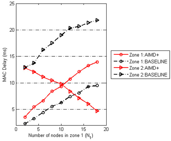 We, finally, compared the MAC delay incurred by packets to be successfully transmitted in the group of nodes in Zone 1 and Zone 2 using baseline and AIMD+ as shown in Figure 14. Similar to Figure 10, MAC delay in both zones was determined against the number of nodes in Zone 1 varying from two to 18 while the total number of nodes in network remained constant, i.e., = 20. At first, we see that when = 2 and = 18 delay for Zone 2 was only 13 ms while that for Zone 1 was around 2 ms when using the baseline, however, this delay for both zones increases gradually for both zones when = 18 and = 2. From this observation we can say that baseline is extremely unfair as it imposes unnecessary delay on the minimum number of Zone 2 nodes, i.e., when = 2. Another observation is that when = 10 and = 10 the delay incurred by Zone 2 is almost three times that of Zone 1 using baseline. In contrast to baseline, AIMD+ is extremely fair. For example, when the number of nodes in Zone 2 is reduced from = 18 to = 2 its MAC delay was reduced from 12 ms to 4.6 ms when using AIMD+. It clearly shows that Zone 2 delay was barely influenced by the number of nodes in Zone 1. Another useful observation that we can see from Figure 14 is that when there are equal number of nodes in each zone, = 10 and = 10 MAC delay incurred by each group of nodes is almost same showing that AIMD+ is fair in terms of delay among the two group of nodes.