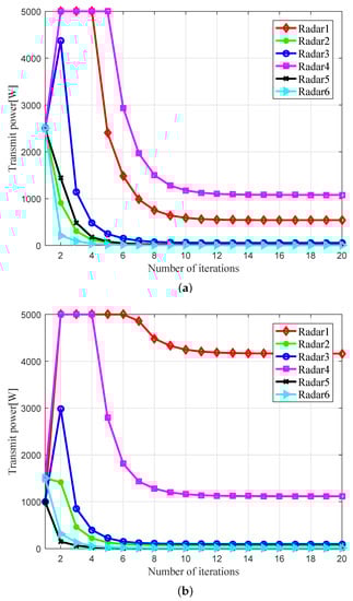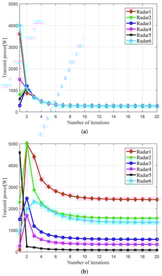Convergence behavior for the transmit power of each radar in the first case: (a) Target position is ; (b) Target position is .