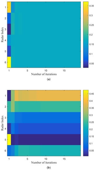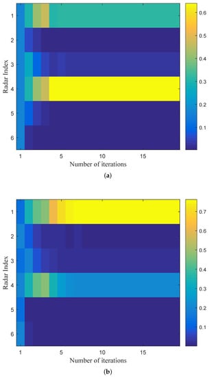 In Figure 4 and Figure 5, we illustrate the convergence process for the transmit power allocation in both cases. Here, we define the ratio of transmit power as [21,22]. One can see from Figure 3b that the proposed LPI optimization scheme would like to assign more transmit power to Radar 1, Radar 2 and Radar 6, which are farther from the target. In addition, from Figure 3a, it can be noticed that more power resource is allocated to Radar 4 and Radar 1, whose RCS with respect to the target is much smaller than other radars. Hence, we can conclude that the transmit power allocation results depend on the system geometry between target and multistatic radar and target reflectivity [26]. Furthermore, as shown in Figure 3b, the proposed optimization algorithm tends to distribute less transmit power to the radars with larger path propagation gains.
