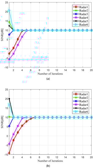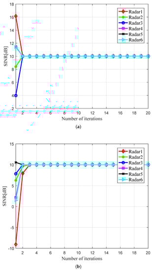 Figure 6 and Figure 7 show the convergence behavior for the achieved SINR of each radar in both cases. As can be interpreted in these figures, by employing our proposed strategy, the achieved SINR value of each radar tends to converge to the predefined SINR threshold after 6–8 iterations, and thus the desired target detection requirement can be satisfied.