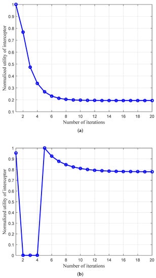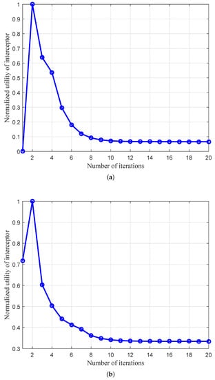 Convergence behavior for the normalized utility of intercept receiver in the second case: (a) Target position is ; (b) Target position is .