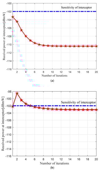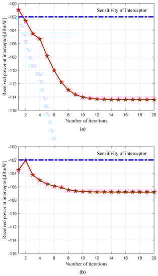 Convergence behavior for the received power at intercept receiver in the second case: (a) Target position is ; (b) Target position is .