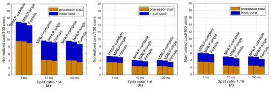 In Figure 4, we present the comparison among normalized cloudlet deployment cost/100 users over the considered circular deployment area by using the MINLP framework on the complete dataset, by using the MINLP framework on a single TDM-PON branch and scaling up the results, and scaling up the results from the newly proposed analytical framework. In this analysis, we consider TDM-PON split-ratio , and values of 1 ms, 10 ms, and 100 ms. The optimal cost values obtained by using analytical framework is expected to be lower bounds to the actual MINLP framework. The workload assignment fractions and are not present in the objective function, but only in the latency constraint; hence, this newly designed framework puts more importance towards meeting the latency constraint. Moreover, this analytical framework is better in terms of estimating cloudlet deployment cost under low-latency requirement than simply converting the integral decision variables of the framework in [8] into continuous decision variables.