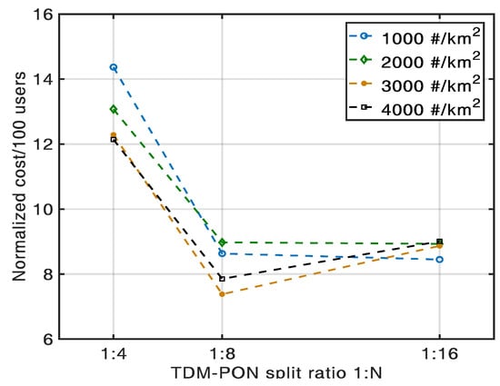 Variation of normalized cloudlet deployment cost/100 users against TDM-PON split-ratio for a circular area with diameter = 4 km and population density = 4000 people/km.