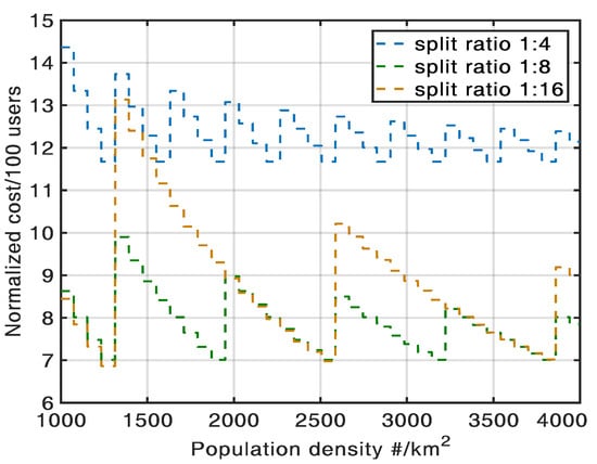 In Figure 6, we show the variation of normalized cloudlet deployment cost/100 users against TDM-PON split-ratio , where with = 1 ms. We vary the population density from 1000 to 4000 people/km in steps of 1000. From these plots, we observe that the normalized cloudlet deployment cost decreases with increase in split-ratio from 1:4 to 1:8, because a lower number of TDM-PON branches are required to handle the workload and all cloudlets are installed at same CO locations. However, there is a slight increase in the normalized cost as the split ratio is further increased to 1:16. This happens because the framework chooses to install all cloudlets at RN locations, where the cost of cloudlet installation is higher than that of CO locations. We further observe that the normalized cost is higher for lower population density with smaller split-ratio, e.g., with split-ratio 1:4, normalized cost for 1000 people/km is higher than that of 4000 people/km. However, this behaviour is reversed with a higher split-ratio 1:16.