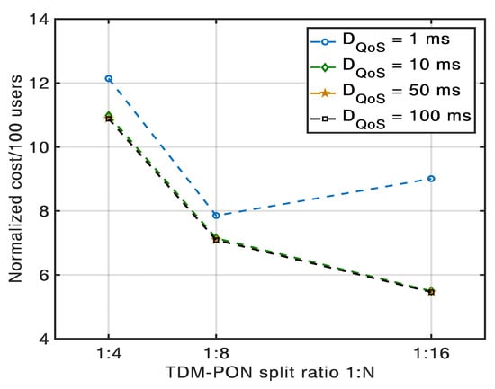 Next, Figure 8 shows the variation of normalized cloudlet deployment cost/100 users with population density 4000 people/km against TDM-PON split-ratio where while varying . These plots follow similar trends as we observed in Figure 6. The normalized cloudlet deployment cost first decreases as split-ratio increases from 1:4 to 1:8, and then the normalized cost slightly increases again for the split-ratio 1:16. Note that the normalized costs for a stringent QoS requirement of = 1 ms are highest and gradually continue to become lower as the QoS requirement is relaxed to = 100 ms. This behaviour is observed due to the fact that a higher amount of computational resources (i.e., processors) are required to meet a stringent = 1 ms than a lenient = 100 ms.