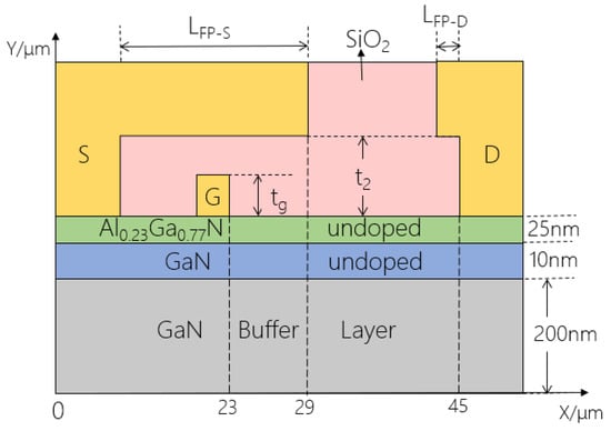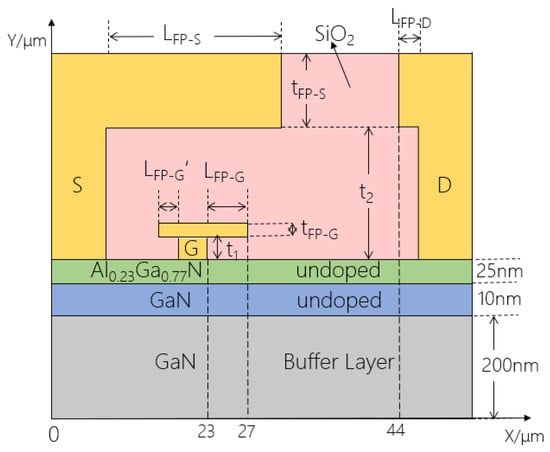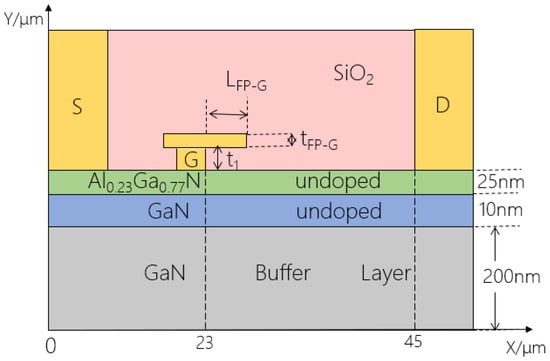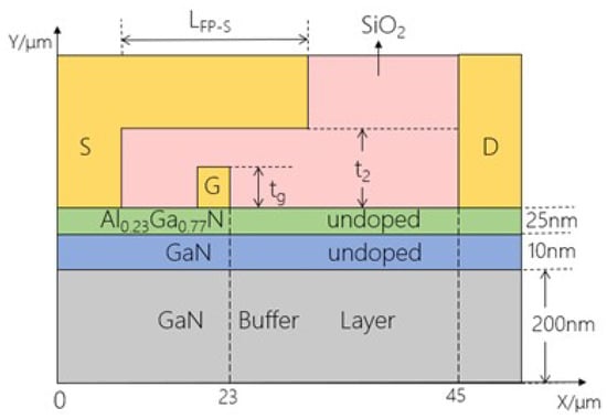 - Benny Sathish, M.; Fletcher, A.S.A. Design and modeling of HEMT using field plate technique. In Proceedings of the 2017 International Conference on Innovations in Electrical, Electronics, Instrumentation and Media Technology (ICEEIMT), Coimbatore, India, 3–4 February 2017; pp. 157–159. [Google Scholar] [CrossRef]