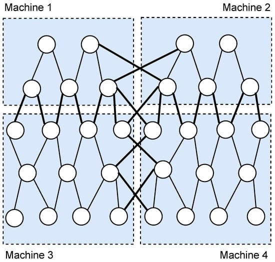 In order to make the learning process more efficient, practical asynchronous stochastic gradient descent (ASGD) is proposed in [], including data parallelism and model parallelism. Data parallelism means the training dataset for updating weight vector can be distributed. That is to say, the dataset consists of data from multiple distributed data providers. Every machine used for training model has a replica of all weights. Model parallelism is separating the model into several parts which can be updated by different machines. A typical example of model parallelism is depicted in Figure 1, which is proposed in []. There are learning participants included in four machines (represented by four blue rectangles with dotted lines as boundaries) in this example. The five-layer deep neural network model is separated into parts. The thick lines connecting nodes in different rectangles are called crossing weights, which are responsible for collecting different parts of models trained in different machines. The model is usually separated according to the computational capability of machines.