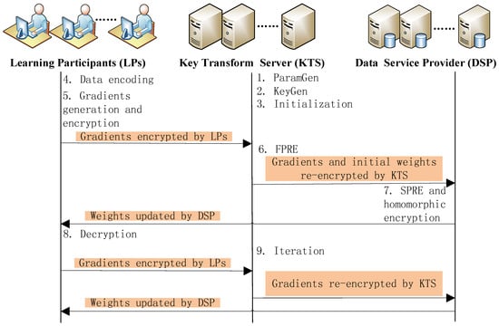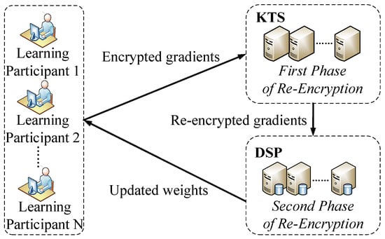 - First phase of re-encryption (FPRE): After receiving the ciphertext , , …, from learning participant 1, 2, …, N respectively, KTS performs FPRE over them. Take the ciphertext received from learning participant i for example to describe the first phase of re-encryption algorithms. First KTS computes the hash value and then the re-encrypted ciphertext:Finally, KTS sends and to DSP.It is noticeable that if a gradient component is used for updating a crossing weight, then it should be re-encrypted with the public key of the learning participant the crossing weight assigned to.