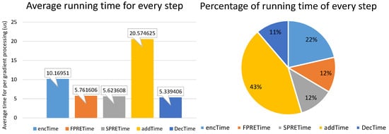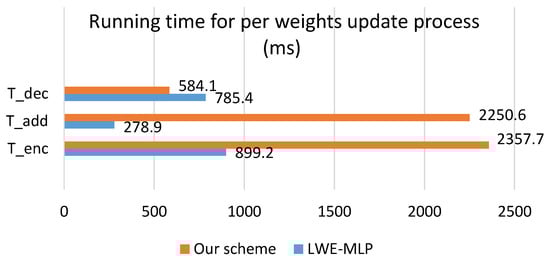 The experimental results comparison is shown in Figure 5 and Table 5. In Figure 5, of our scheme consists of there parts: running time of encryption, FPRE and SPRE. In Table 5, means the running time of using our scheme to process the gradients and update the weights. It consists of five parts in our scheme: encryption (1112.4 ms) and decryption (584.1 ms) by learning participants, FPRE (630.2 ms) by KTS, SPRE (615.1 ms) and homomorphic addition (2250.6 ms) by DSP. On the other hand, the LWE-MLP scheme in [], consists of there parts: encryption (899.2 ms) and decryption (785.4 ms) by learning participants, homomorphic addition (278.9 ms) by DSP.