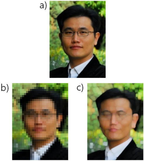 Privacy masking technologies refer to modifications that prevent facial information contained on video recordings from being recognized [6,7,8]. Examples of privacy masking include blurring, pixelation, and facial-region removal, all of which are fraught with the fundamental limitation that the original footage cannot be recovered fully when recovery is needed (see Figure 1).